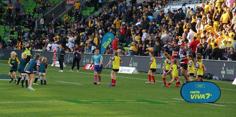 Well, our Girls 7s team can never get enough of their beloved AAMI Park turf in Melbourne as they again took to the field at half time, this time for the Wallabies v Fiji test match. They were kindly invited by the ARU & VRU to play Viva 7s rugby to showcase the VRU Viva 7s program that they participate in on Sunday afternoons at Anderson Park. They made us all very proud as they put all of their hard work at training into action on a beautiful Saturday afternoon of test match rugby. Some of the Viva 7s girls and Racing Rugby Club girls lined up against our own Kiwi Hawthorn team to compete in front of over 13,000 spectators and they received a magnificent reception from those in the stands.