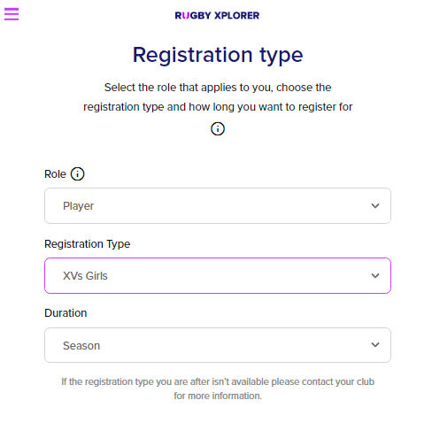 During registration, all players should select ‘XV Juniors’ except for U14 and above girls who should select ‘XV Girls’ as below: